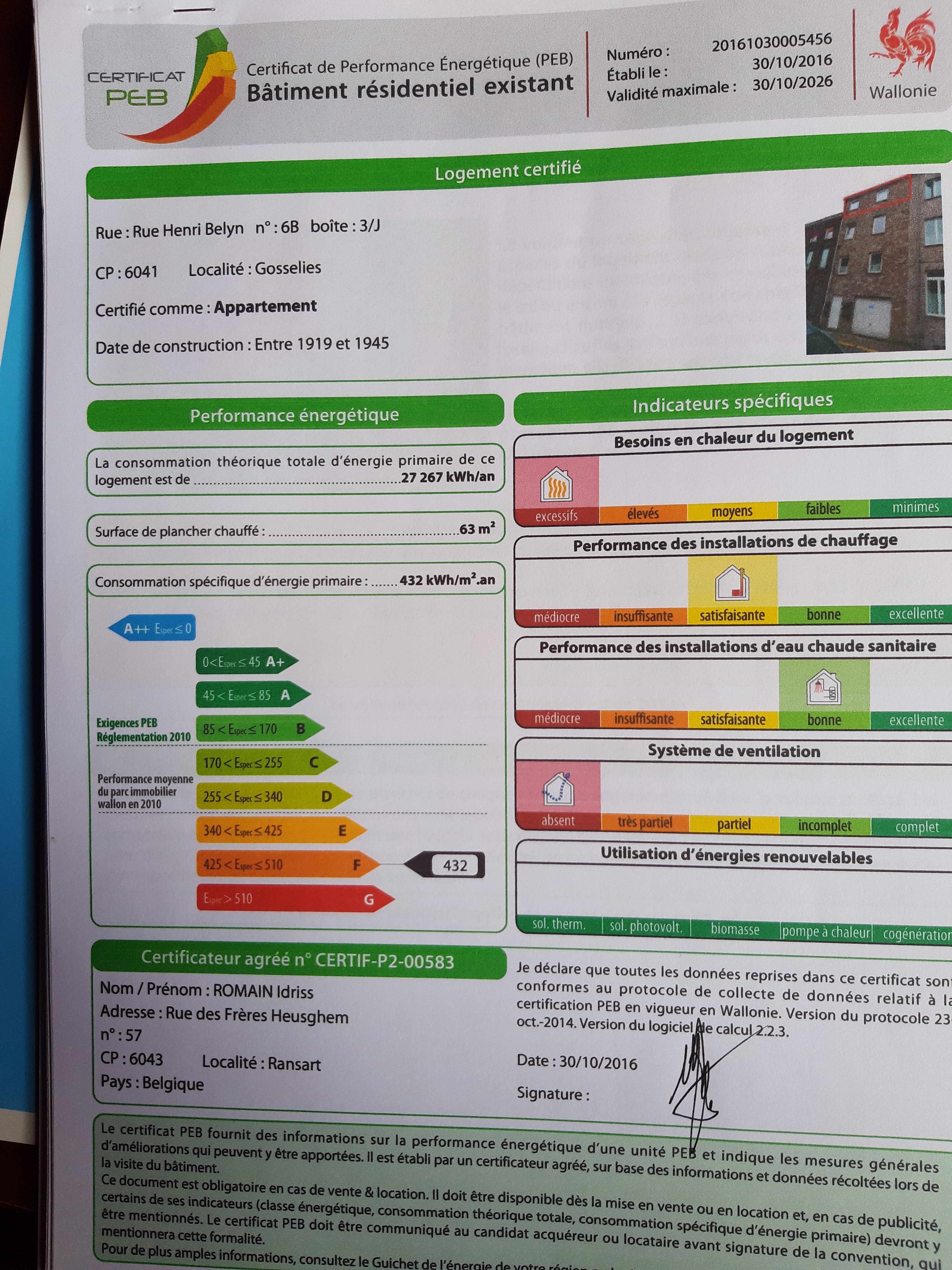 PEB : 20161030005456; Classe F = 432Kwh/m².an.